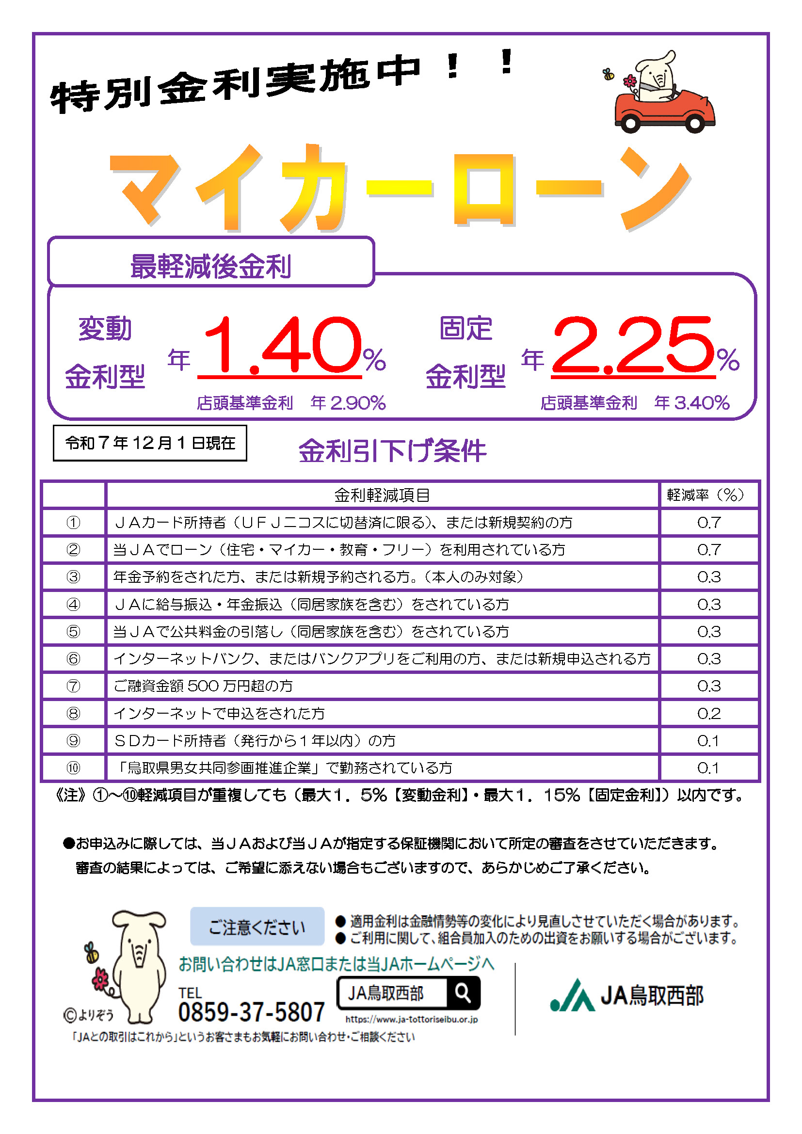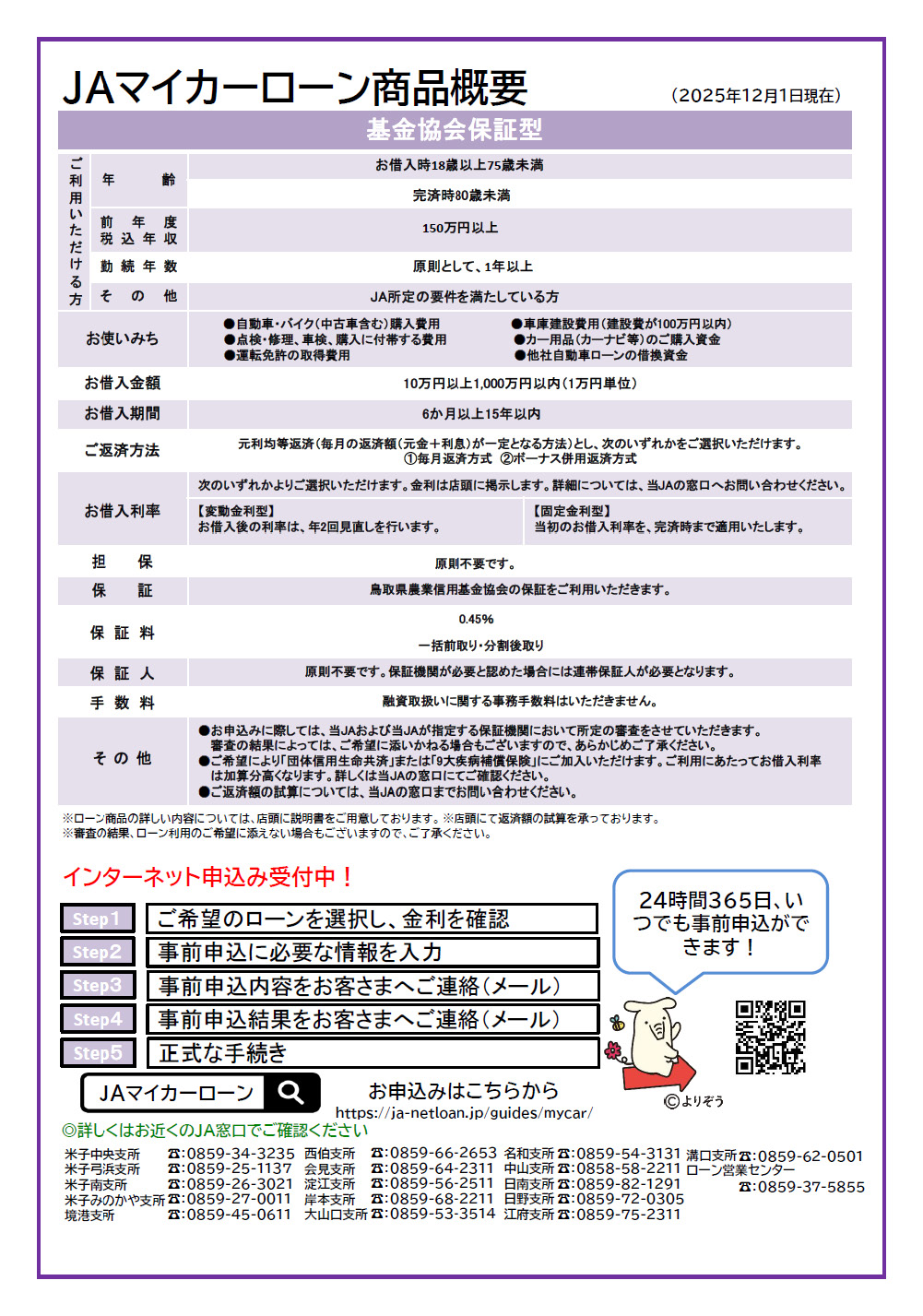 身近で便利、安心なJAマイカーローン!。新車・中古車の購入、修理・車検などにご利用ください!