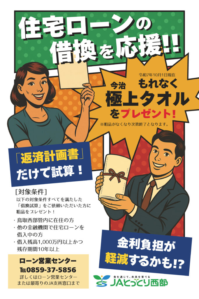 • ただし、鳥取西部管内在住の方で、お借入残高1,000万円以上かつ残存期間10年以上の住宅ローン(他金融機関)に限ります。