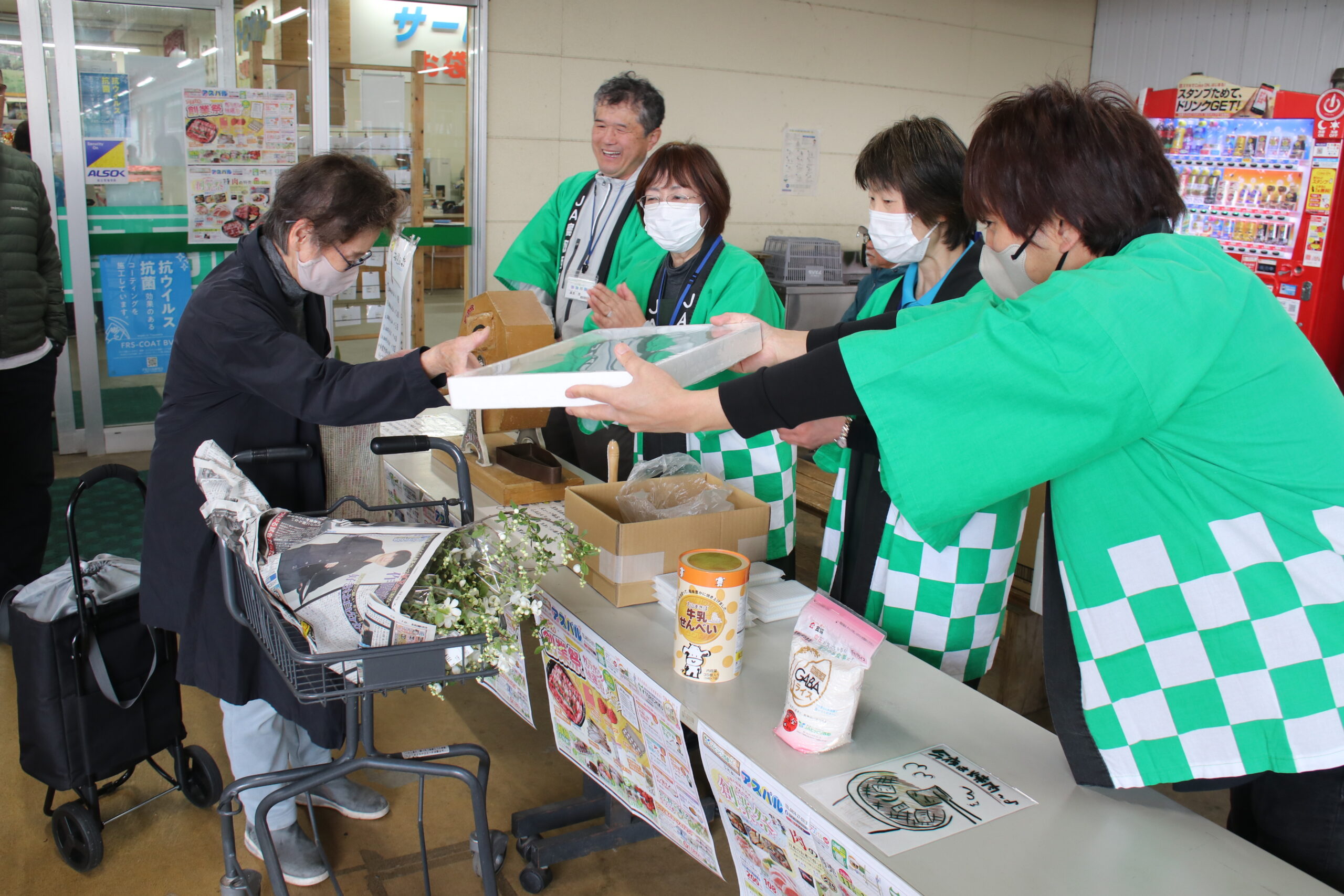 JA鳥取西部の直売所ふれあい村アスパルは4月11日から13日の3日間、「アスパル創業祭」を開催し、大勢の来場者でにぎわいました。ガラポン抽選会や豆つかみ大会、くじ引きなども行い、来場者に日頃の感謝を伝えました。