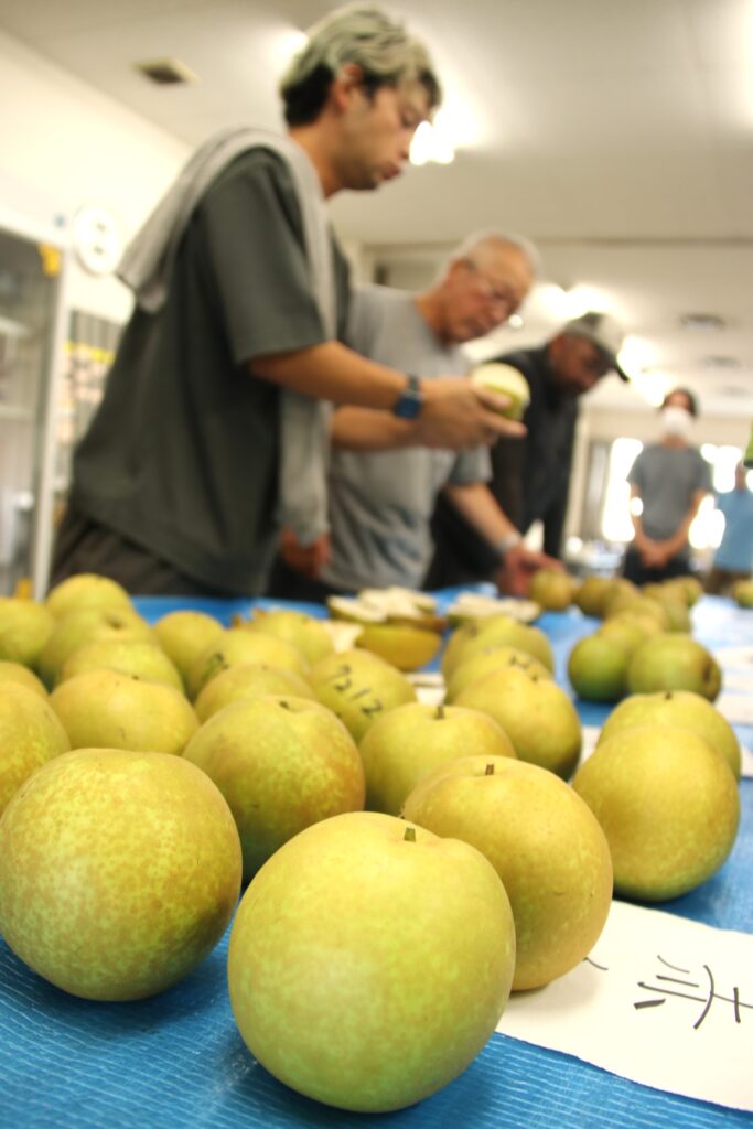 JA鳥取西部は9月16日、米子・あいみ果実選果場で梨「甘太」の目合わせ会を開き、初選果日を9月19日に決めました。「甘太」の大きさや果重、糖度などを計測し、目合わせで出荷基準などを確認しました。「甘太」は、「新甘泉」、「秋甘泉」に続く「甘甘シリーズ」としてPRしています。