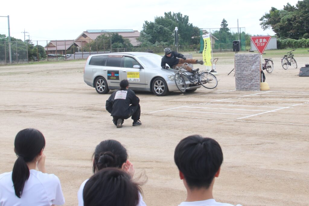 JA鳥取西部とJA共済連鳥取は9月19日、県警察本部や琴浦大山警察署などと連携し、名和中学校で自転車交通安全教室を開きました。スタントマンが自転車の交通事故を再現し、自転車利用頻度が高い中学生に事故の怖さを疑似体験させ、交通安全への意識を高める取り組みを行いました。