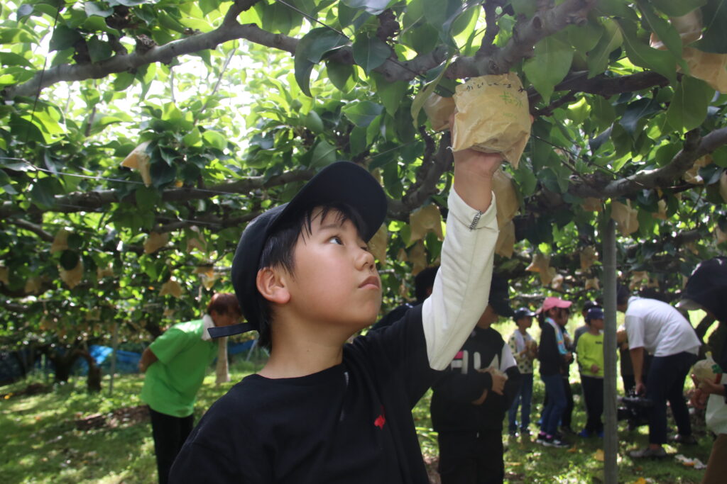 中山小学校は9月4日、JA大山梨選果場で梨の選果・箱詰め作業などを見学した後、梨の収穫を体験しました。梨は、6月に自分たちが袋かけした「二十世紀」を収穫しました。