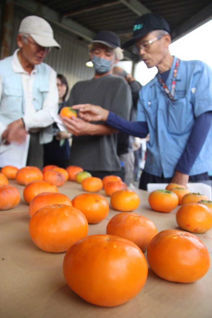 【2025年産柿の出荷に向け、巡回で生育や仕上がりなどを調査】