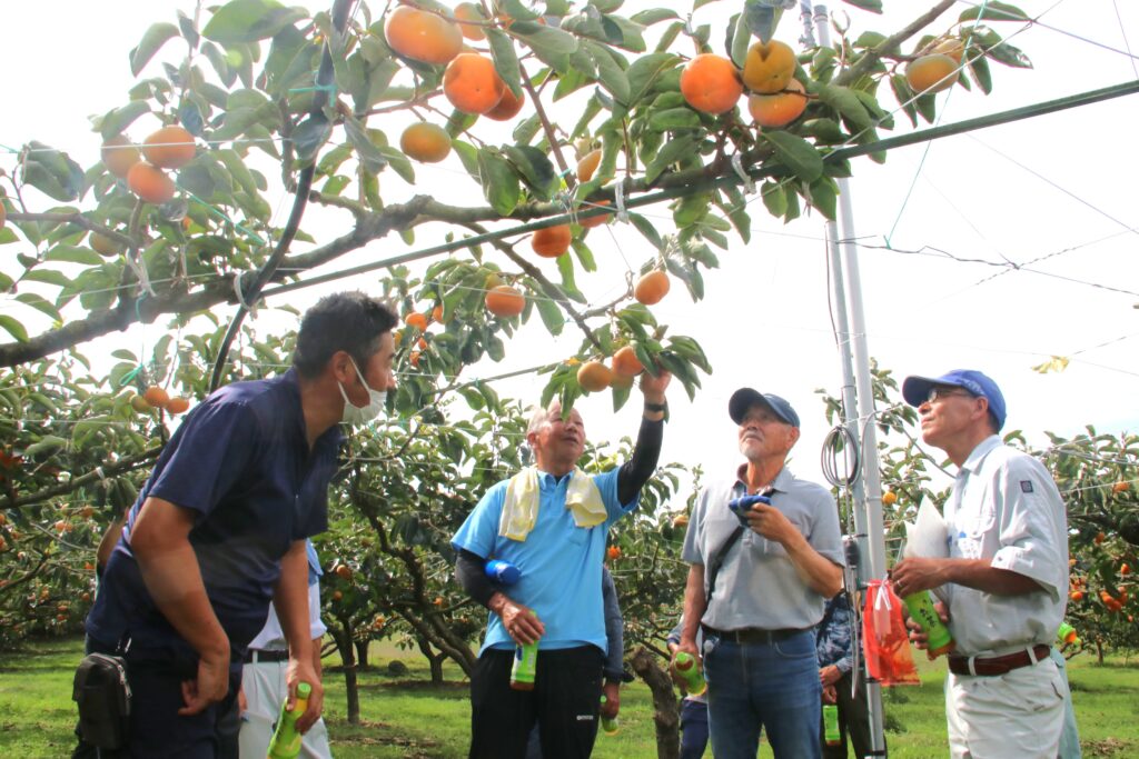 JA鳥取西部管内の柿生産者らで構成する西部地区柿指導者協議会は9月24日、柿園5カ所を巡回し、2025年産柿「輝太郎」と柿「西条」の生育状況などを調査しました。大きな病害虫被害もなく、概ね順調な生育を確認し、巡回後は検討会を開き、調査結果を報告して今後の栽培管理について意見を交わしました。