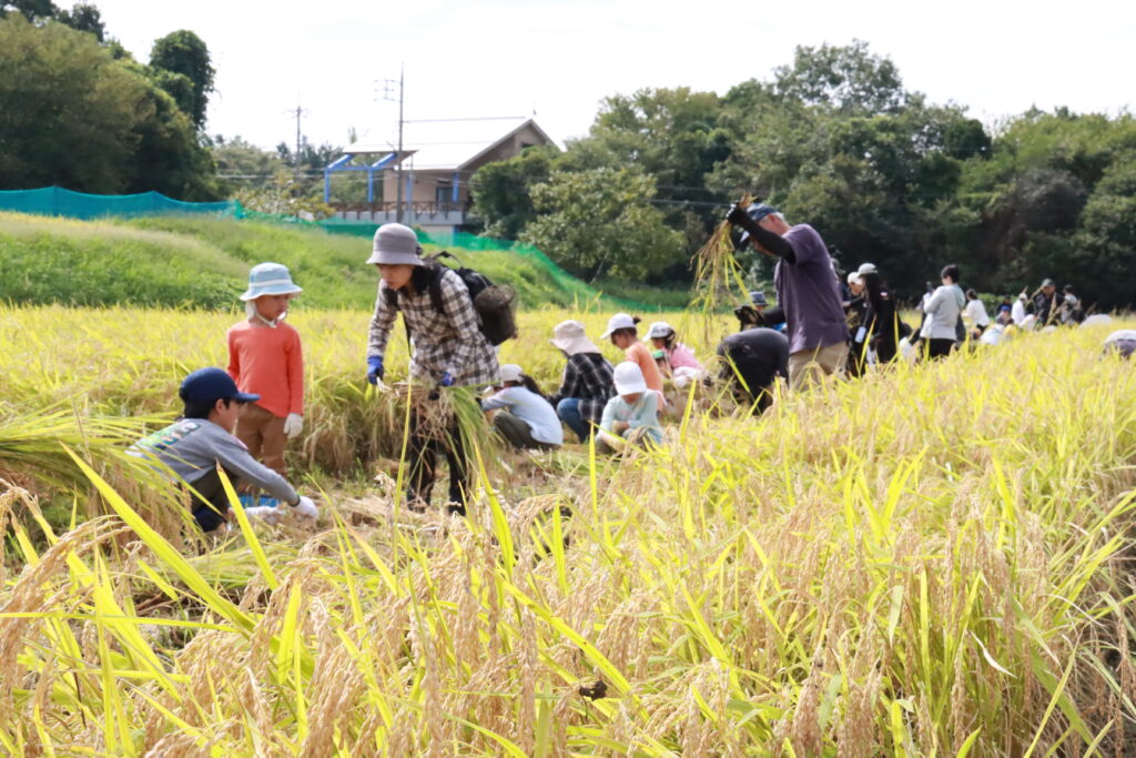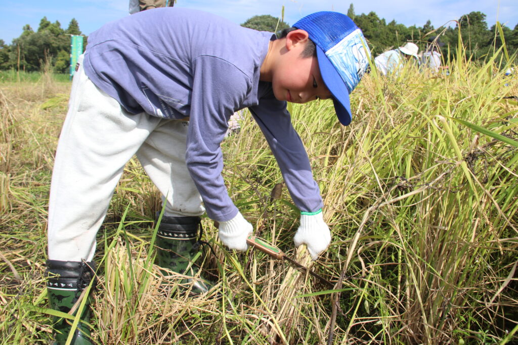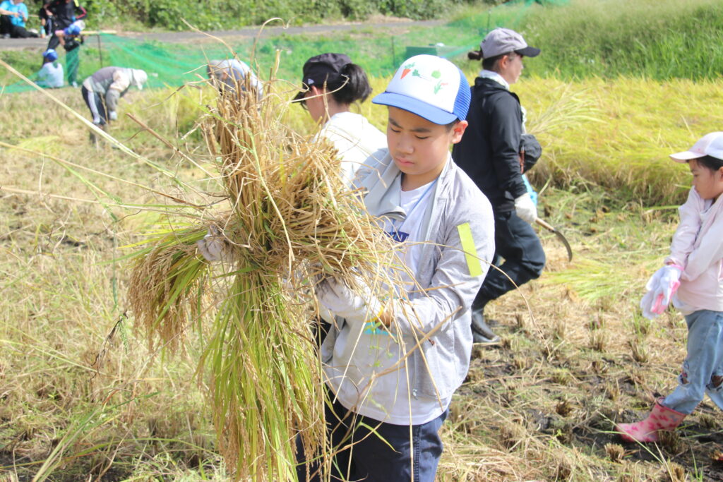 秋空の下、稲の刈り方や束ね方などの指導を受け、交流田に豊かに実ったコシヒカリの刈り取り作業に挑戦しました。最初は鎌を使った刈り取りに苦戦していた子どもたちも親子で協力し、次第に手際よく作業を進めていました。
