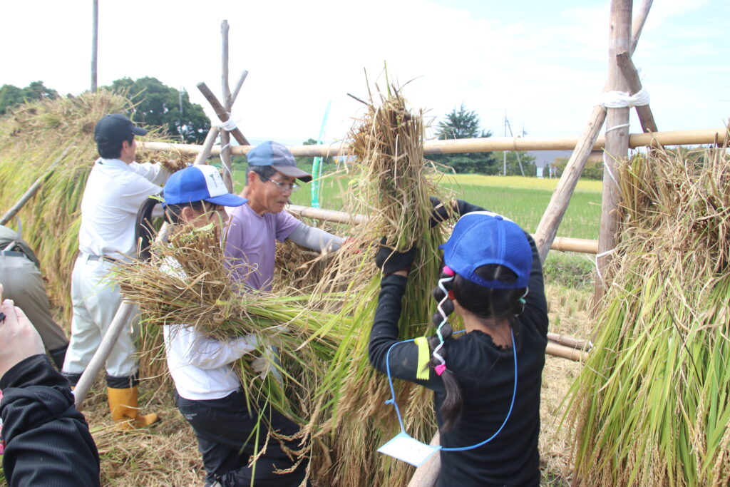 刈り取った稲はワラで束ね、乾燥させるために「はで木」にかけ、収穫した米は、10月18日と19日に「農と食のフェスタinせいぶ」で無料配布するおにぎりに使用します。