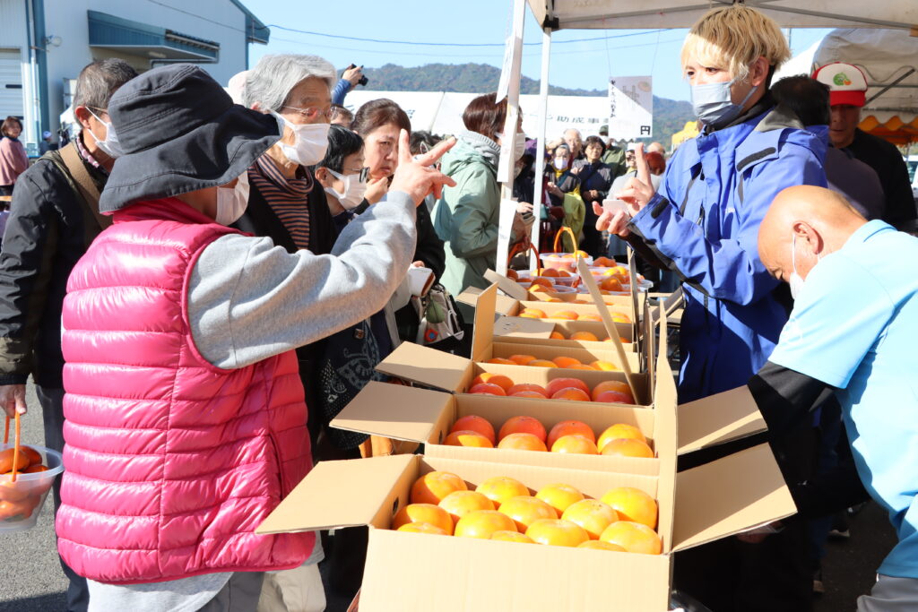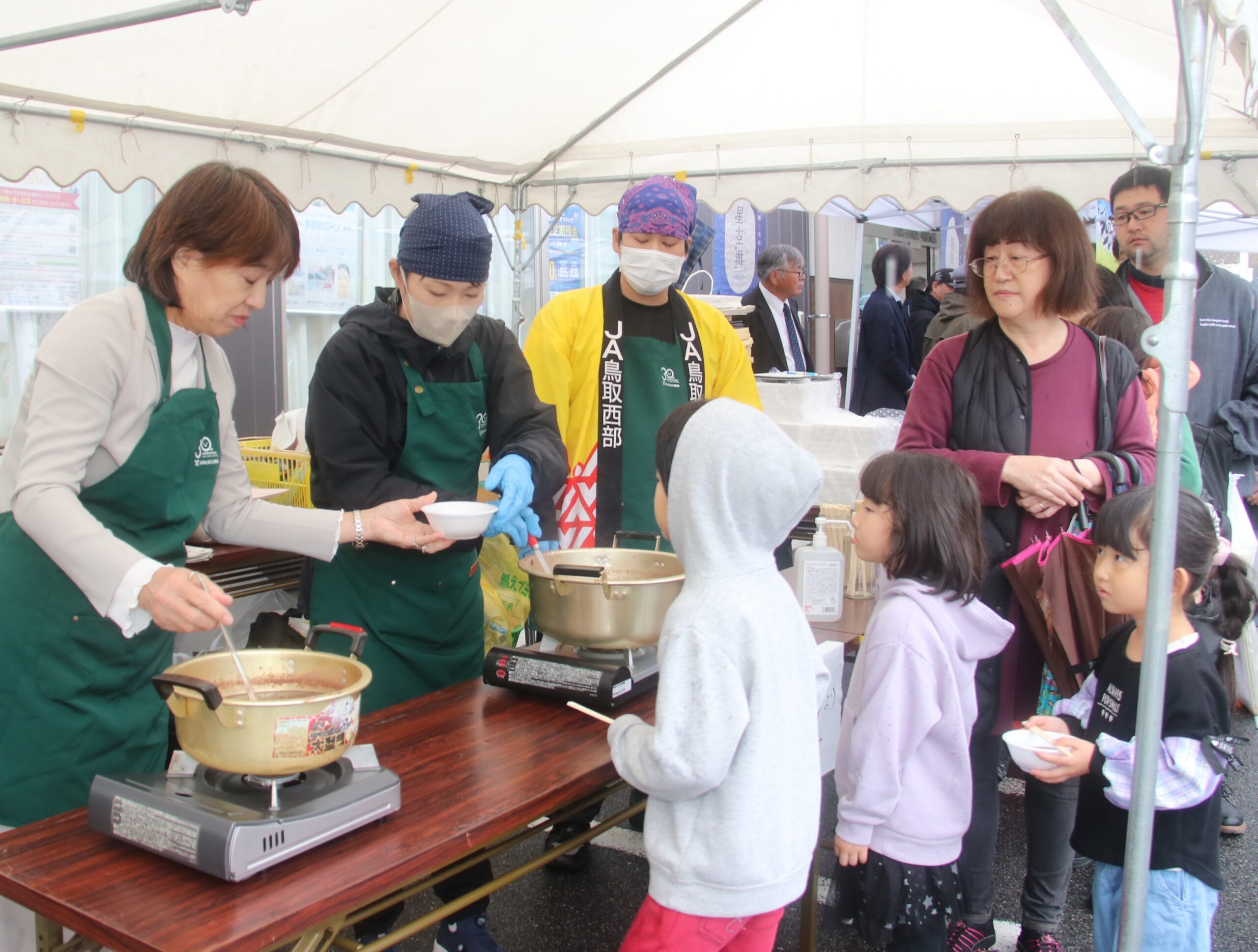 JA鳥取西部では、南部町と大山町の2会場で、地域とふれあうJAイベントを2日連続で開催しました。11月15日、米子南部カントリーエレベーターでは、「JA米子南・会見ふれあいまつり」を合同開催しました。米子あいみ果実部が設けた「富有柿」販売コーナーが大きな注目を集め、開場前から長い列でした。16日には、名和支所前で「JA名和まつり」を開催しました。JA青壮年部が地元産のブロッコリーや白ネギを販売し、女性会は豚汁やつきたてのモチをふるまい、行列ができる人気ぶりでした。