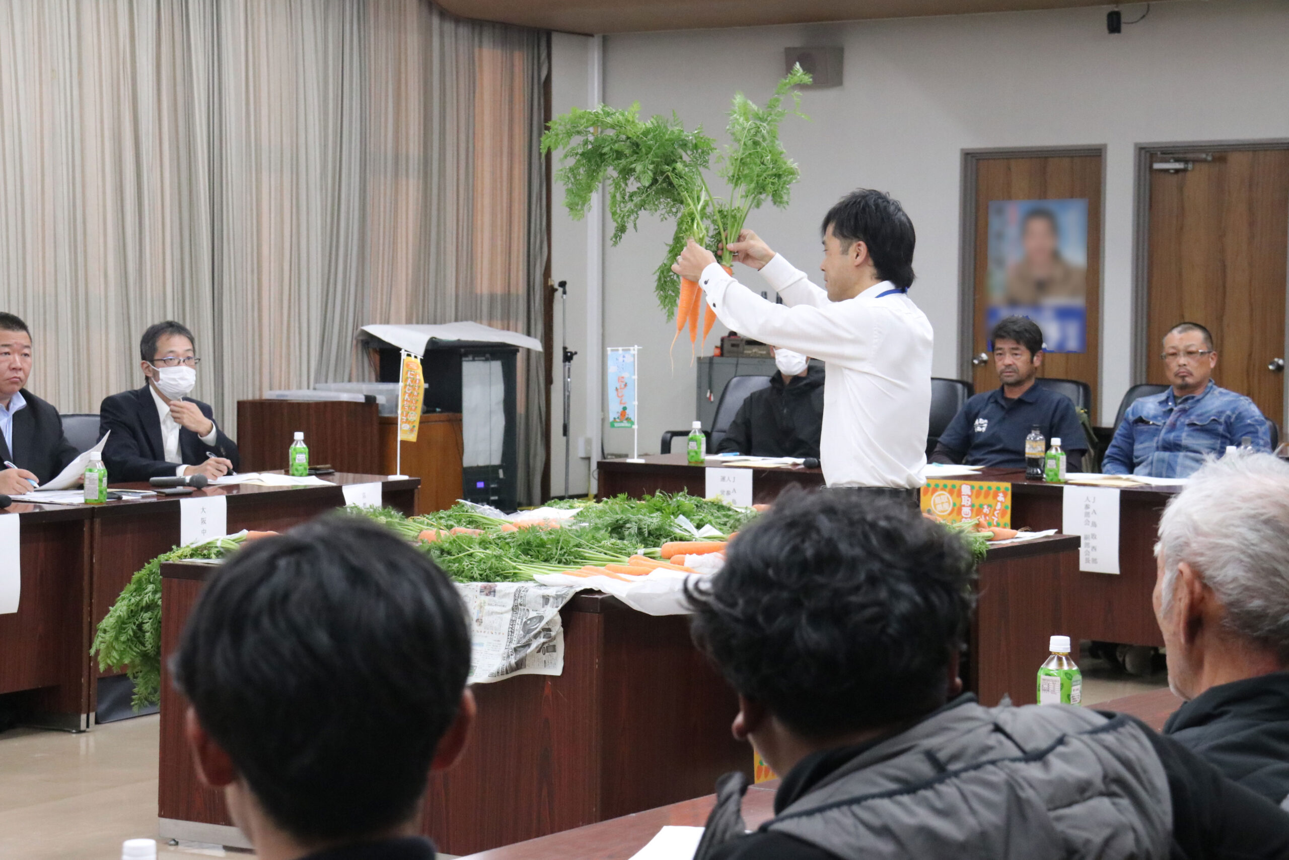 JA鳥取西部人参部会は11月7日、JA本所で秋冬人参出荷協議会を開き、生産者が持ち寄った秋冬人参を確認し、初出荷日を個選が前年より2日遅い11月16日、共選は前年より1日遅い11月14日に決めました。