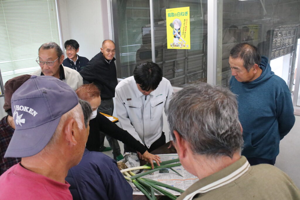 JA鳥取西部大山町白ねぎ部は11月19日、大山青果物集出荷予冷センターで秋冬ネギの出荷目合わせ会を開きました。白ネギの需要が高まる冬場に向けて規格統一を図り、高品質出荷を目指します。また、今後の病害虫防除や積雪前の土寄せなど栽培管理の徹底を呼び掛けました。