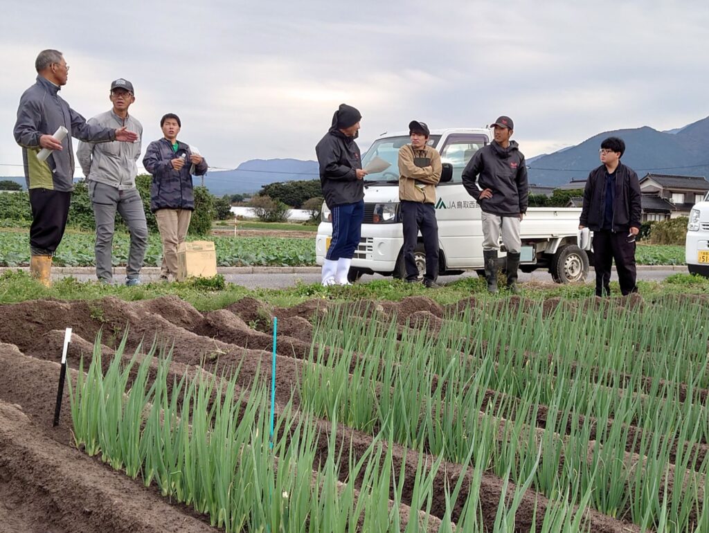 JA鳥取西部大山町白ねぎ部は11月12日、白ネギ現地講習会を開きました。2025年産秋冬ネギや26年産春ネギの生育状況などを確認し、栽培管理の徹底を申し合わせました。