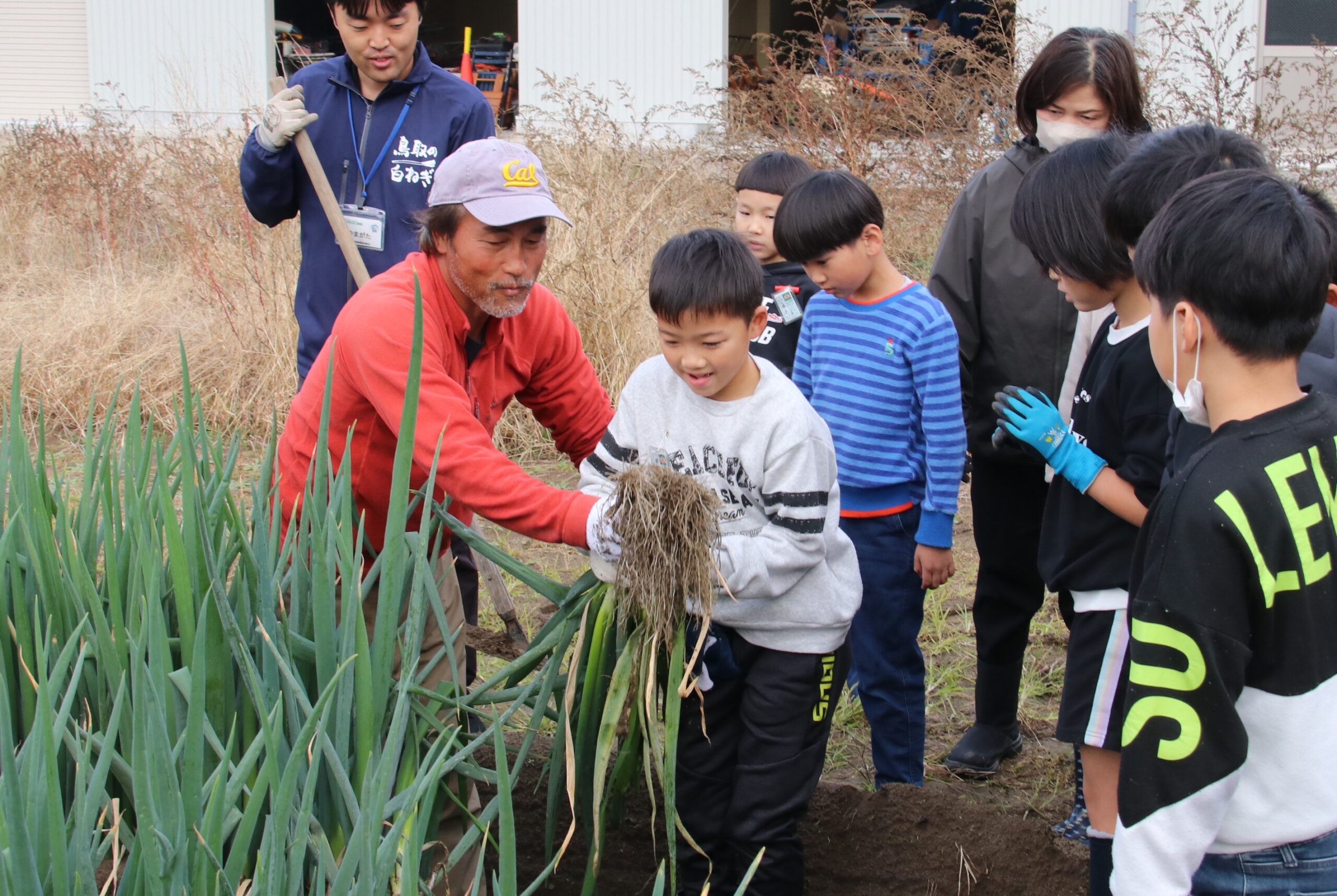 崎津小学校の児童が11月26日、県オリジナル白ネギブランド「伯州美人」の収穫体験を行いました。収穫体験には、地元白ネギ農家が協力。児童は「伯州美人」や作業についての説明を聞いて圃場に入り、葉を力いっぱい引っ張り、見事な「伯州美人」をいくつも収穫していました。収穫後は、児童が根や葉をハサミで出荷規格の長さに切りそろえ、皮をはぐなどして、出荷に必要な調製作業も体験しました。