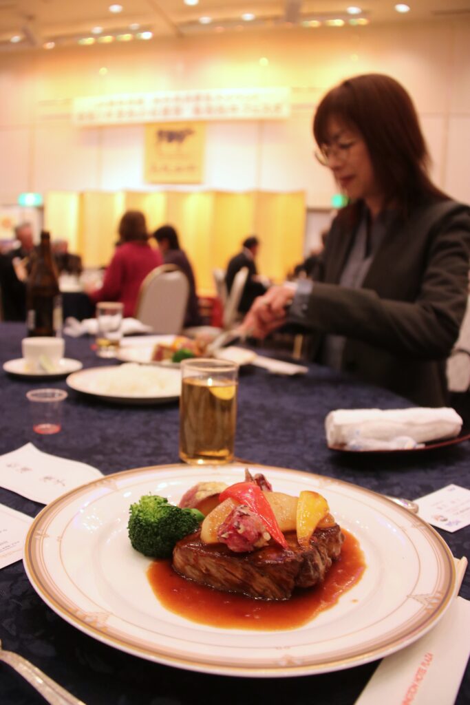 JA鳥取西部は「いい肉の日」の11月29日、米子ワシントンホテルプラザで鳥取和牛肉の消費拡大イベント「2025年度秋の収穫祭 鳥取和牛フェスタ」を開きました。フェスタでは「いちぼ肉のカルパッチョ」や「しぐれ煮」、「サーロインのグリエ」などの鳥取和牛肉の料理が次々とテーブルに運ばれ、参加者の目と舌をおおいに楽しませていました。