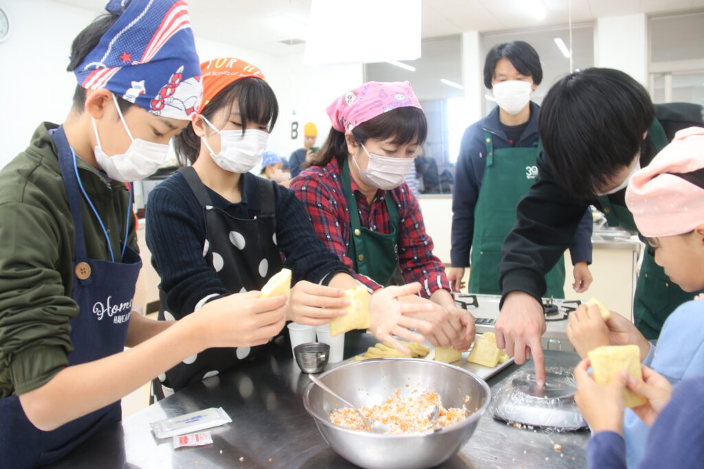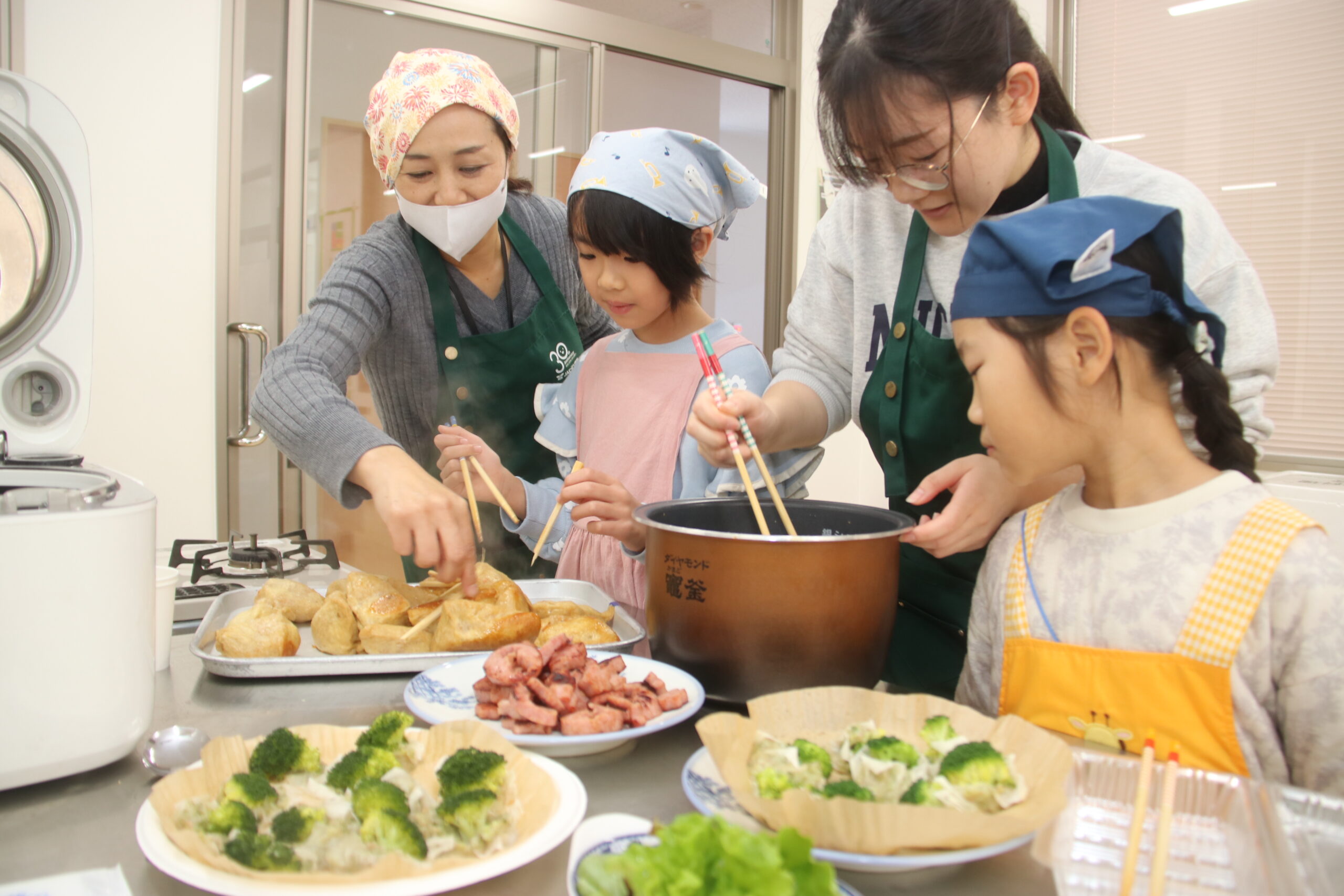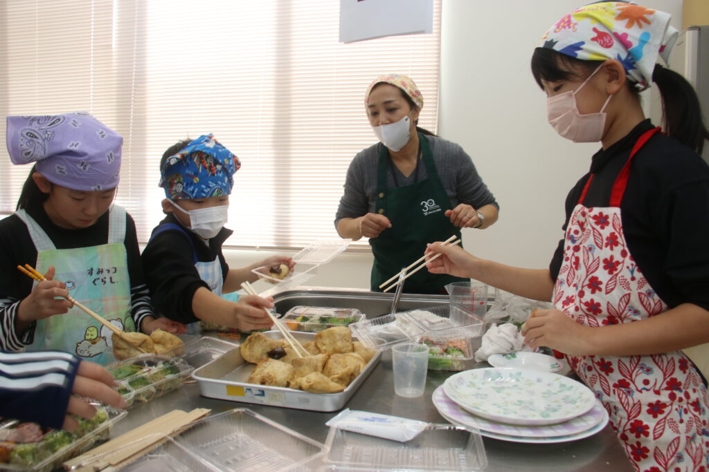 スクール生は協力して調理に取り組み、完成した料理は自分たちでパックに詰めて弁当として持ち帰りました。スクール生からは「『いただき』やしゅうまいを上手に包むことができて楽しかった。家族と食べるのが楽しみ」などの声が聞かれました。