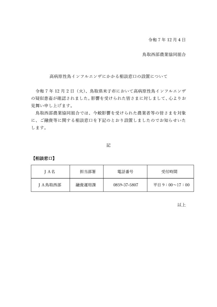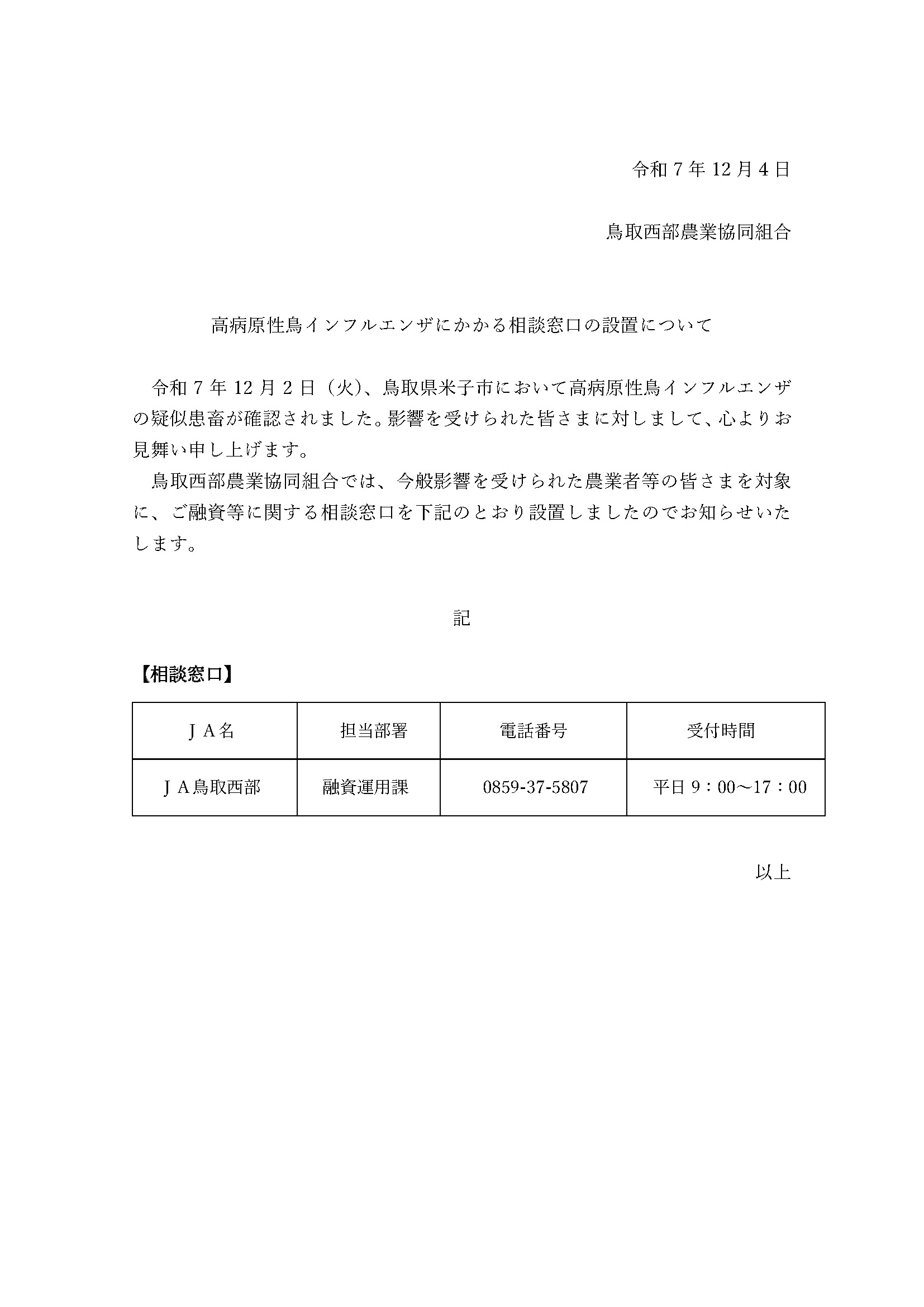鳥取西部農業協同組合では、今般影響を受けられた農業者等の皆さまを対象に、ご融資等に関する相談窓口を下記のとおり設置しましたのでお知らせいたします。