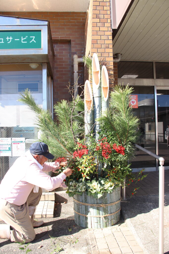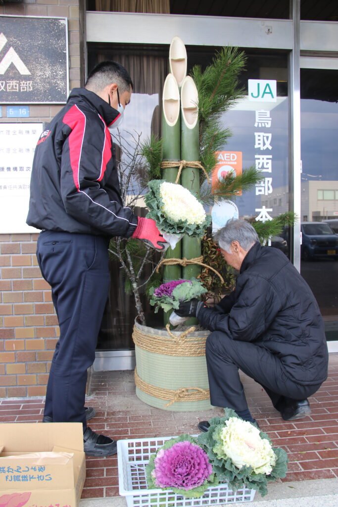 JA鳥取西部名和支所年金友の会は12月23日、支所玄関前に毎年恒例の門松を飾っていただきました。会役員らが松や竹、梅、ハボタン、ナンテン、センリョウなどの材料を持ち寄り、協力して加工や飾り付けなどの作業を行い、高さ2メートルを超える立派な門松が完成していました。