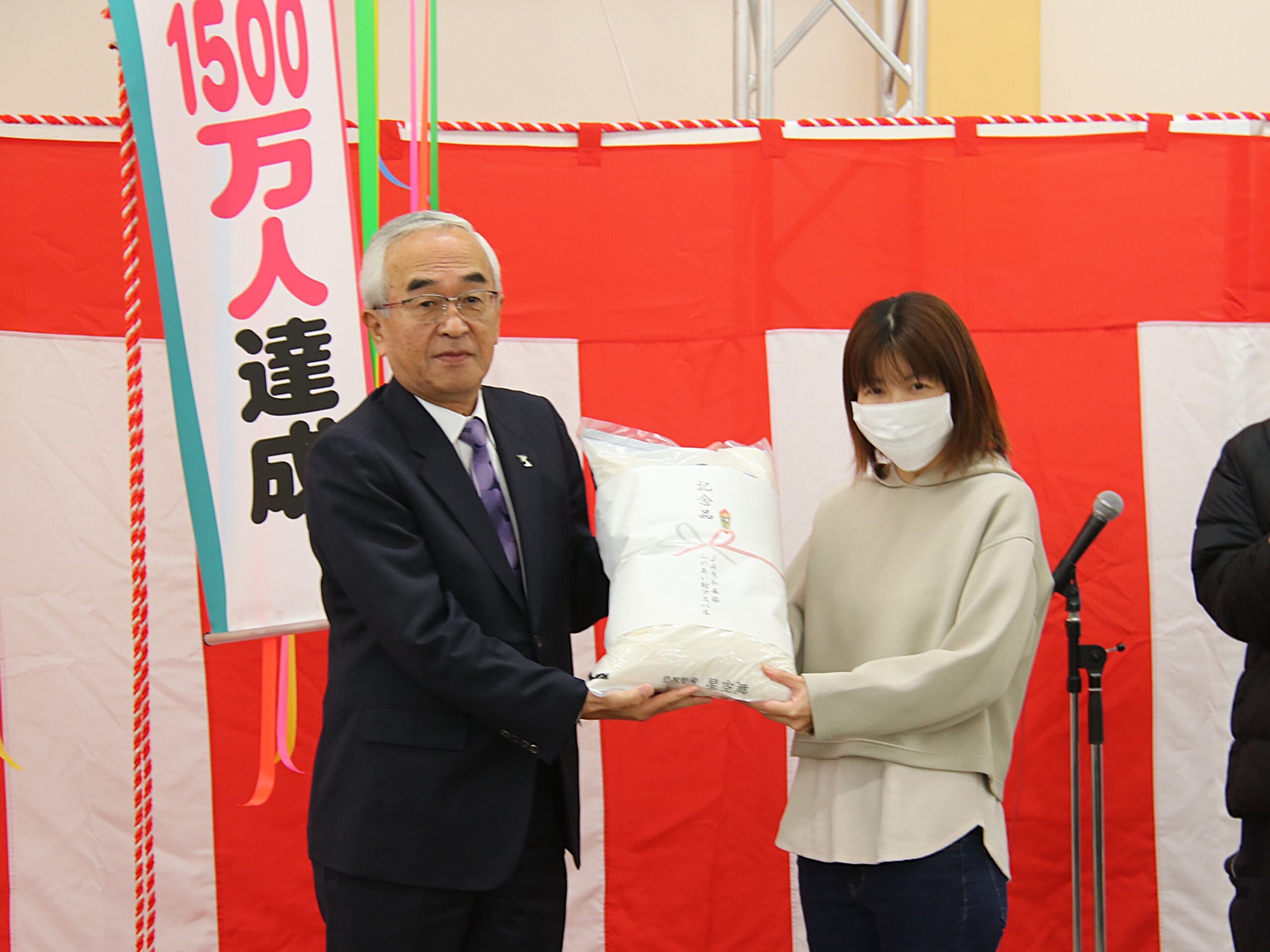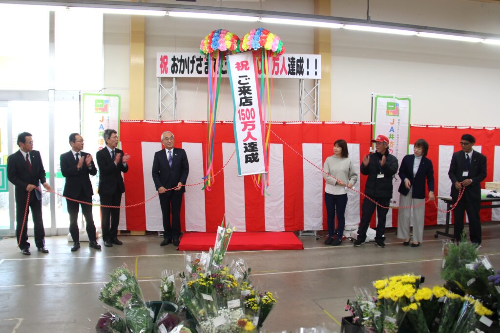 JA鳥取西部農産物直売所「ふれあい村アスパル」は12月9日、オープンから23年9カ月で来店者数1500万人を達成し式典を開き、くす玉を割って節目を祝いました。アスパルでは、来店者数1500万人達成を記念して、12月12日から12月14日まで大感謝祭を開催します。新米や境港産カニなどを特別価格で販売し、14日はガラポン抽選会なども行います。