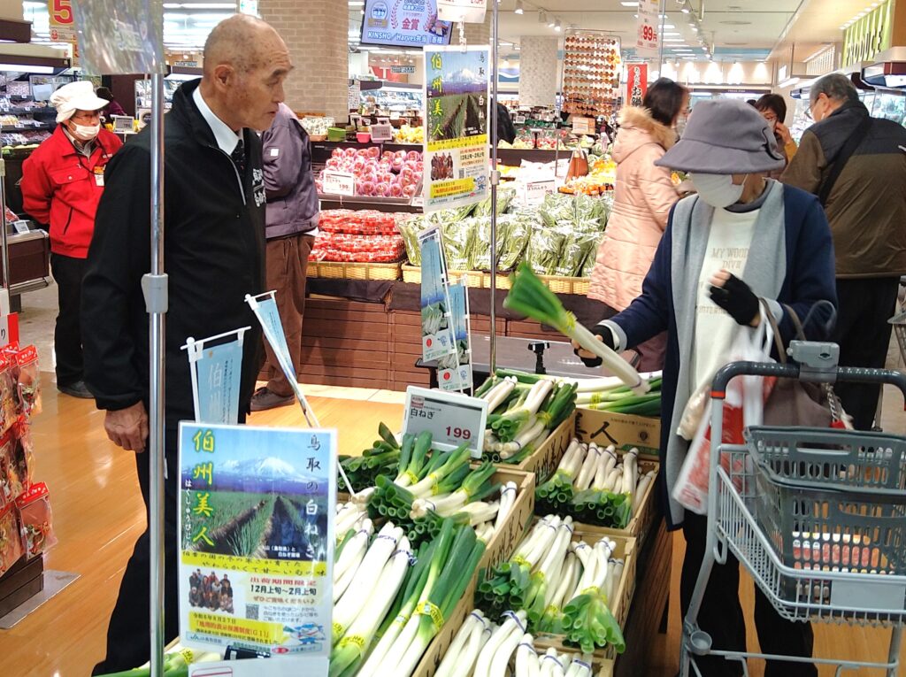 奈良県スーパー「近商ストア真美ケ丘店」が12月中旬の4日間(11、12、18、19日)、「鳥取県GI(地理的表示)フェア」を開き、農水省のGI保護制度に登録された鳥取の白ネギブランド「伯州美人」などをPR販売しました。12月19日には、「伯州美人」と「大山ブロッコリー」がずらりと並び、「伯州美人」の天ぷら試食宣伝など行っていました。