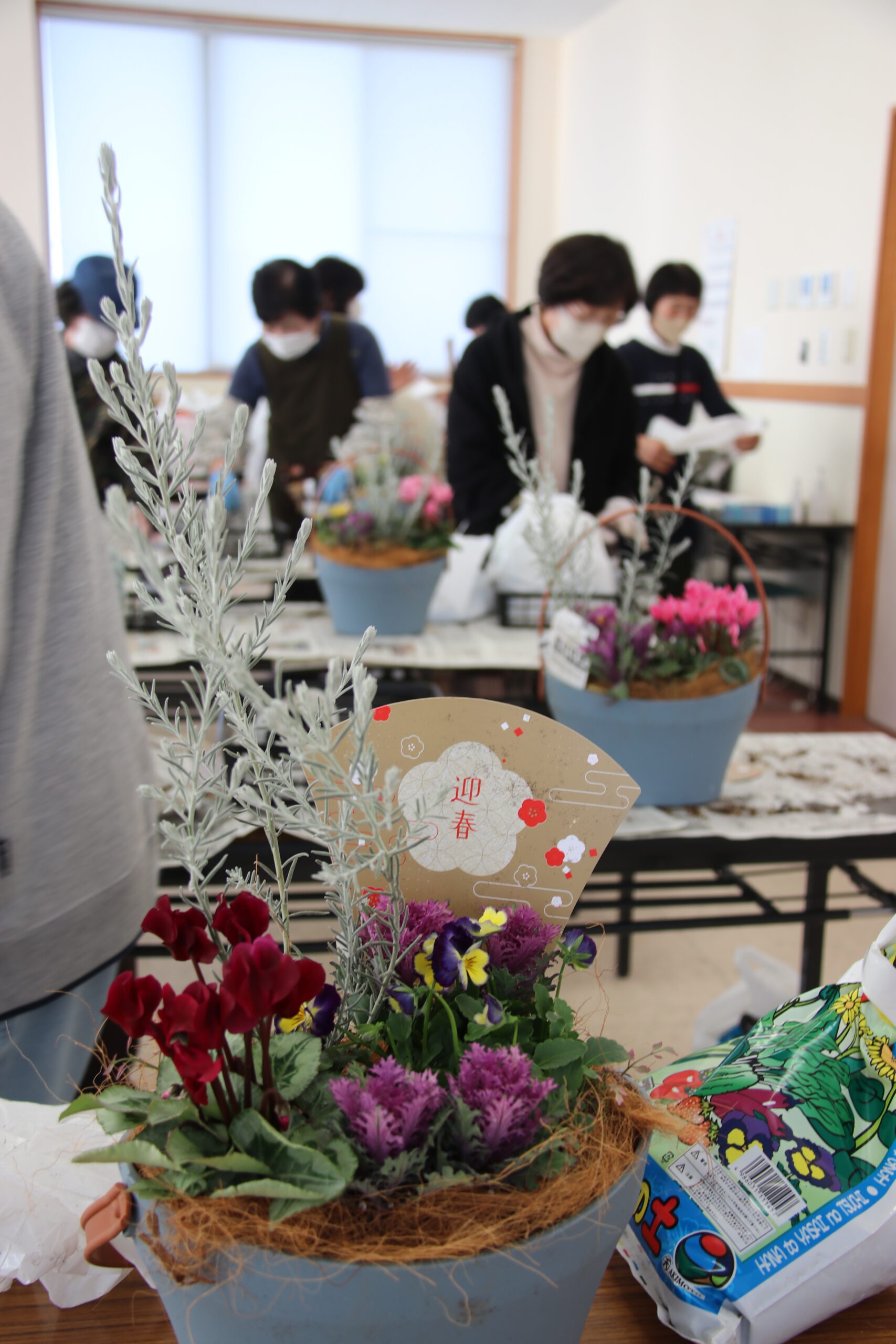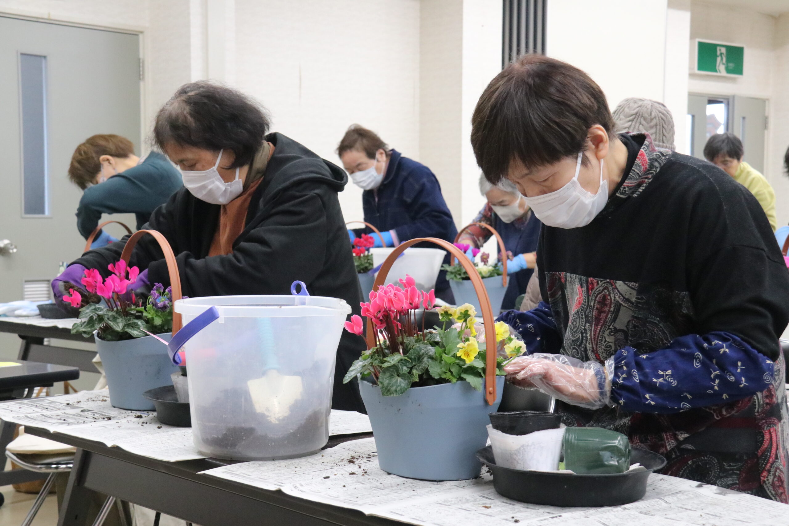 JA鳥取西部女性会米子弓浜支部は12月10日、西伯支部は12月12日に寄せ植え教室を開催しました。参加者はシクラメンや葉ボタンなど季節の花材を用い、講師から根を丁寧にほぐすことや、植え込みは深くしすぎないことなどの実践的な指導を受けながら作品づくりに取り組みました。