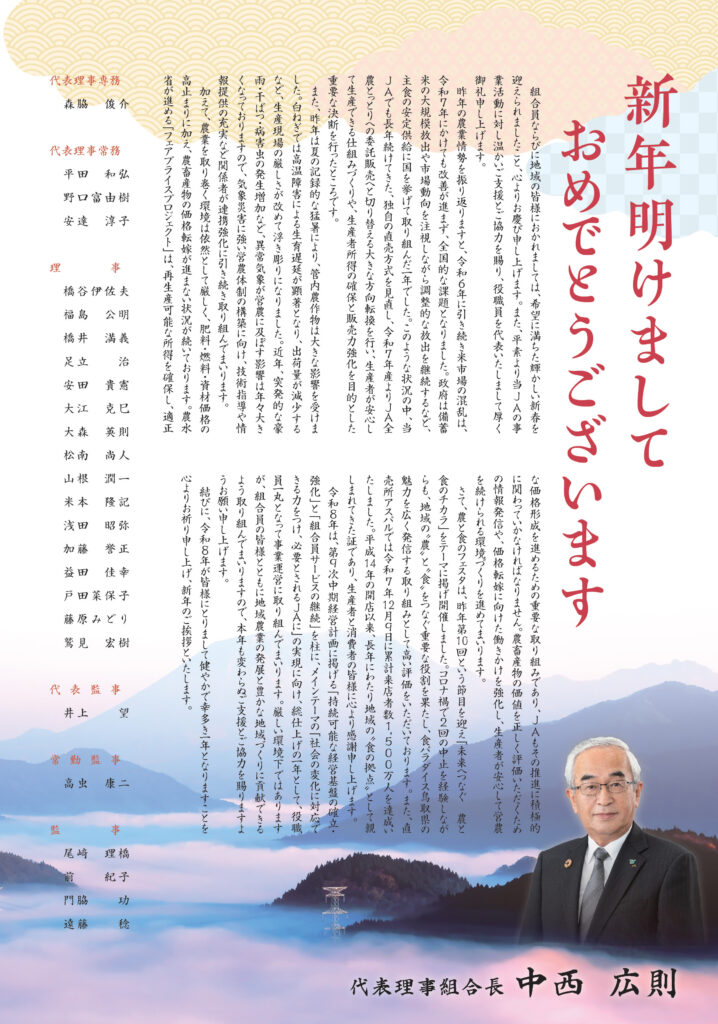 2026.1.1 新年あけましておめでとうございます。 組合員の皆さまは、健やかに新春をお迎えのことと衷心よりお慶び申し上げます。旧年中は当JAの事業運営に対しまして、深いご理解のもと格別のご利用とご支援ご協力を賜り、厚く御礼申し上げます。本年も変わらぬご愛顧いただきますようお願い申しあげます。 JA鳥取西部