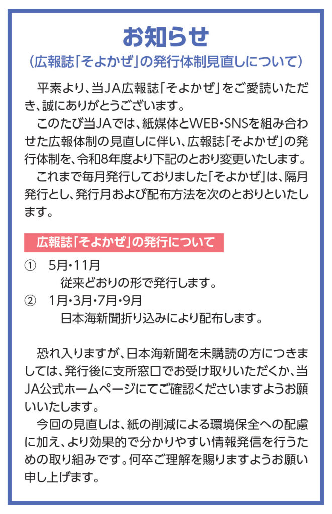 このたび当JAでは、紙媒体とWEB・SNSを組み合わせた広報体制の見直しに伴い、広報誌「そよかぜ」の発行体制を、令和8年より変更いたします。