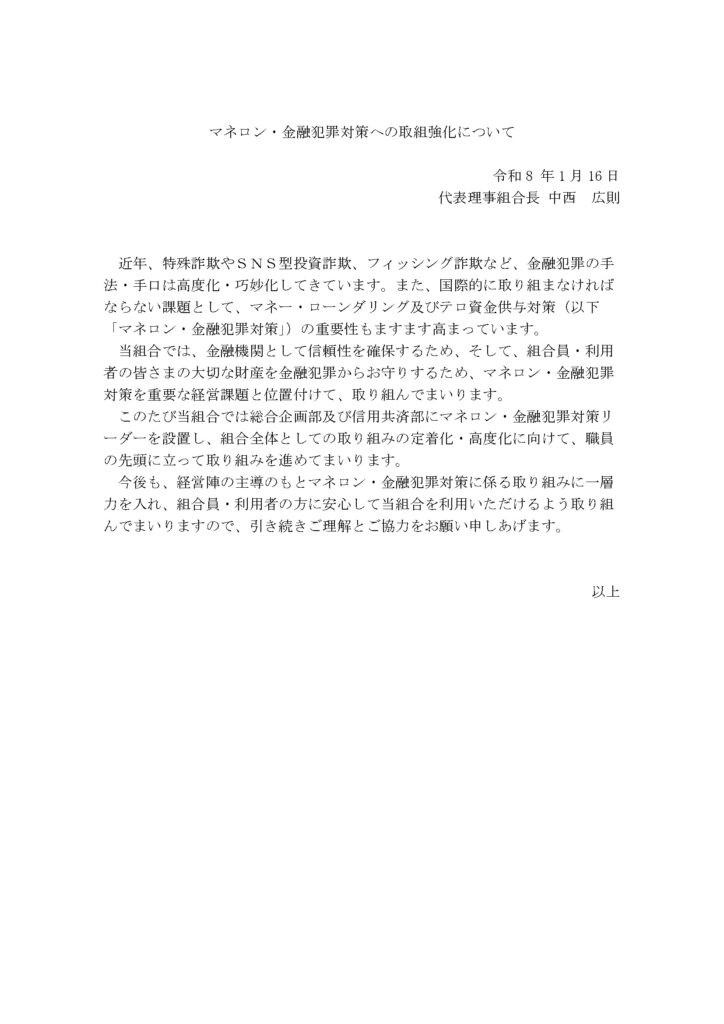 今後も、経営陣の主導のもとマネロン・金融犯罪対策に係る取り組みに一層力を入れ、組合員・利用者の方に安心して当組合を利用いただけるよう取り組んでまいりますので、引き続きご理解とご協力をお願い申しあげます。