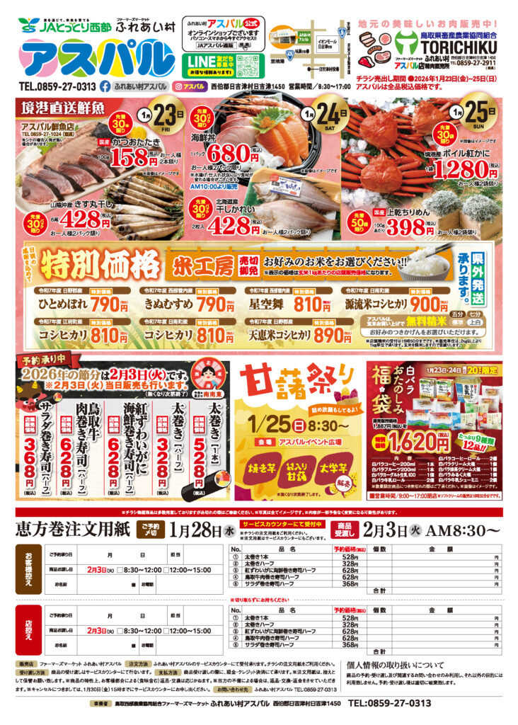 1月23日(金)~25日(日)の3日間、境港直送の鮮魚をはじめ、お米、節分準備に向けた商品、甘藷イベントなど、冬の食卓を彩る週末特売を開催します。
