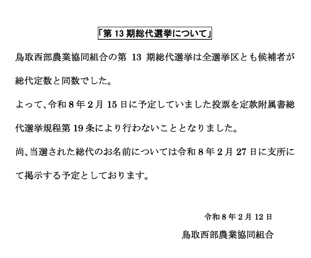 【掲示】第13期 鳥取西部農業協同組合 総代選挙について