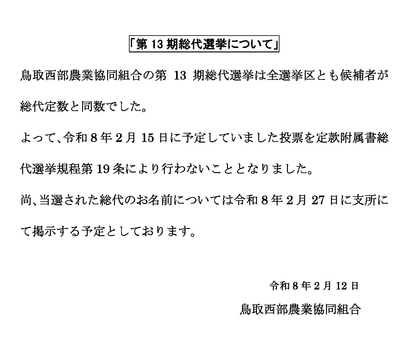 よって、令和8年2月15日に予定していました投票を定款附属書総代選挙規程第19条により行わないこととなりました。