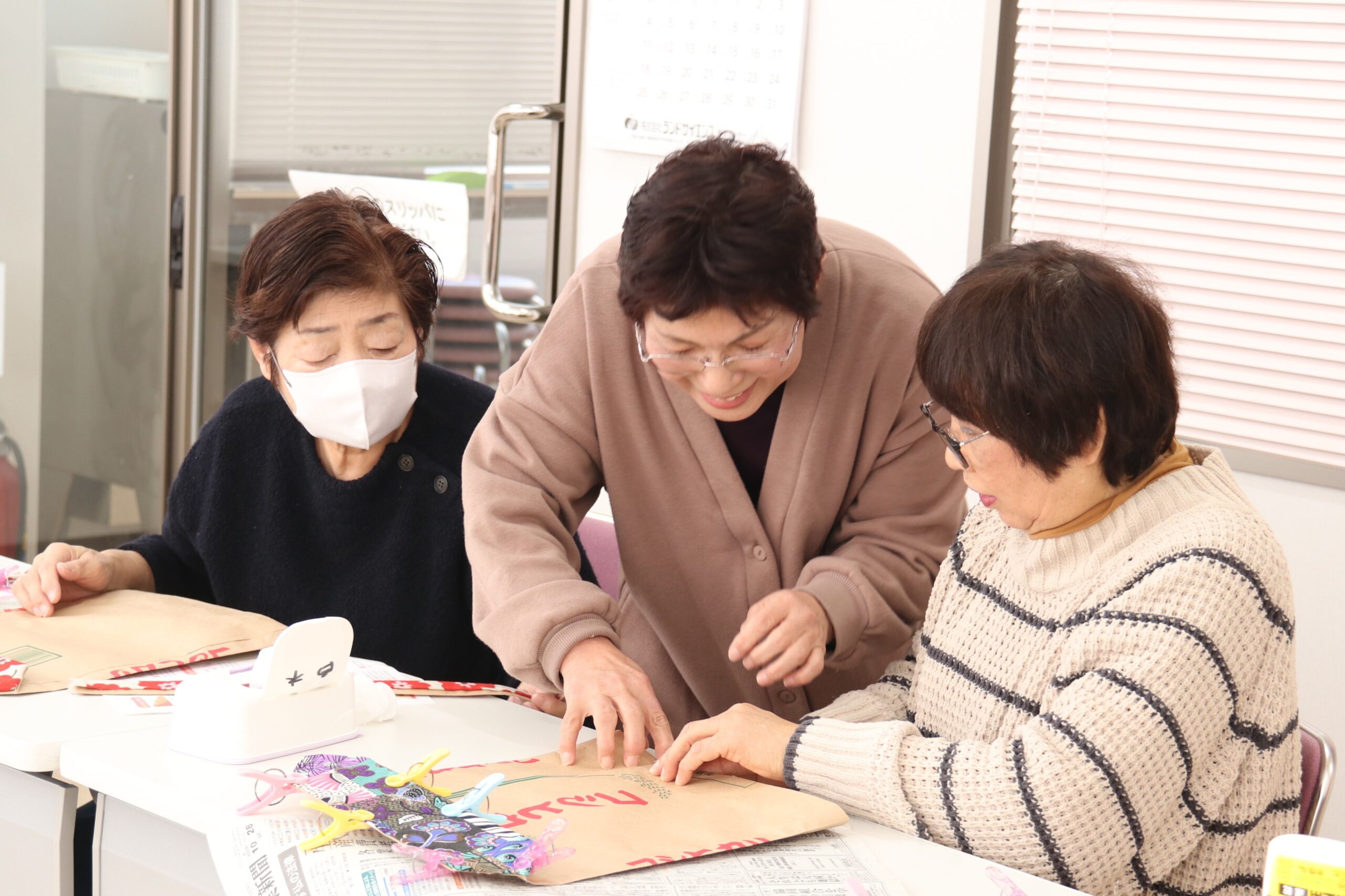 JA鳥取西部は2月12日、米子市の同JA特産物加工・産地交流会館「きらめきはうす」で「米袋を使ったカバン作り教室」を開きました。米袋から作るカバンと新聞紙を使ったコサージュ作りにも挑戦しました。