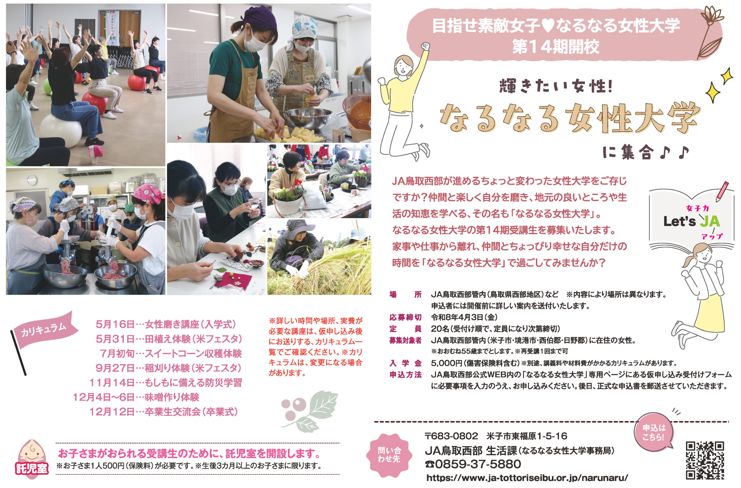 JA鳥取西部が開講する「なるなる女性大学」第14期の受講生を募集します。