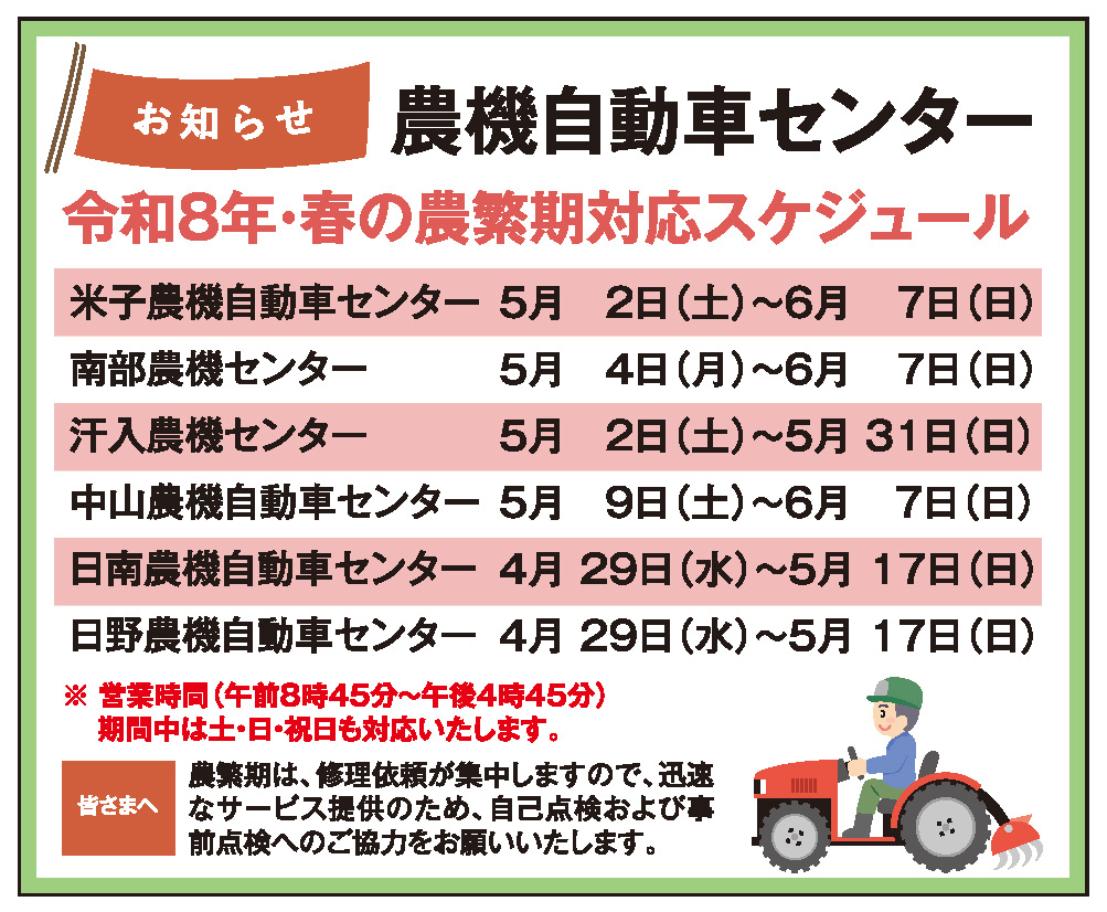 農機自動車センター春期・農繁期対応スケジュールのご案内