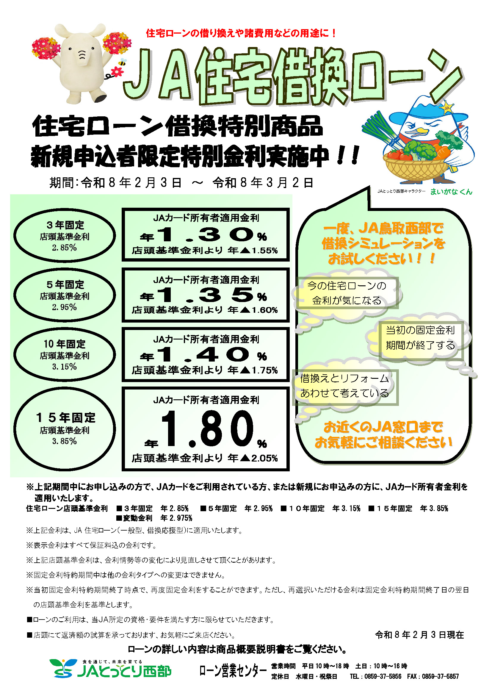 2026.2.2 住宅ローンの金利が気になる方へ!とくとくな選択肢。住宅ローンの借り換えや諸費用などの用途に、ご利用いただけます。 詳しい金利情報はこちら JA住宅ローンのページはこちら ローンのことならなんでもOK!お気軽にご相談ください! ローン営業センター 0859-37-5856 土曜日・日曜日も相談OK! 平日 10:00~18:00 土日 10:00~16:00定休日:毎週水曜日・祝日・年末年始住所:鳥取県米子市東福原1-5-16 JA鳥取西部本所キャッシュコーナー横